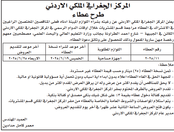 عطاء شراء اجهزة مساحية للمركز الجغرافي الملكي الاردني