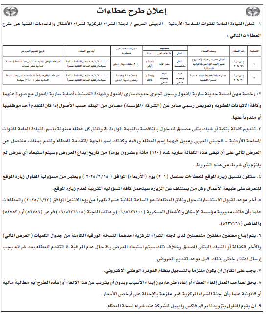 عطاءات صادرة عن القيادة العامة للقوات المسلحة الاردنية