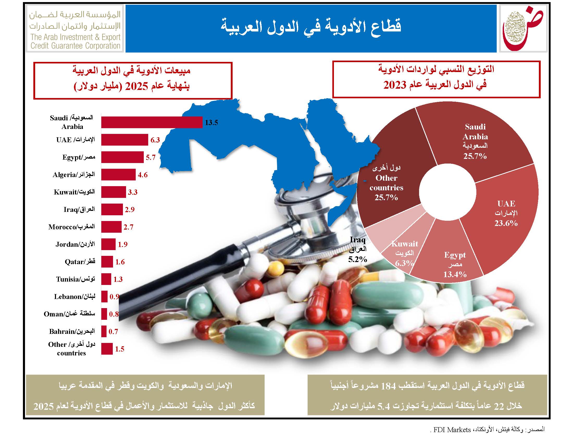 "ضمان الاستثمار": قطاع الأدوية في الدول العربية استقطب 184 مشروعاً أجنبياً بتكلفة استثمارية تجاوزت 5.4 مليارات دولار خلال 22 عاماً