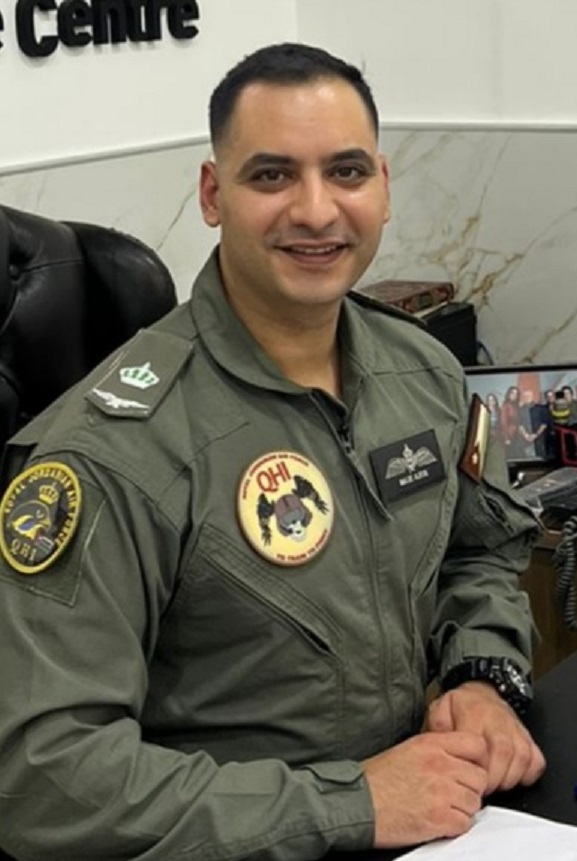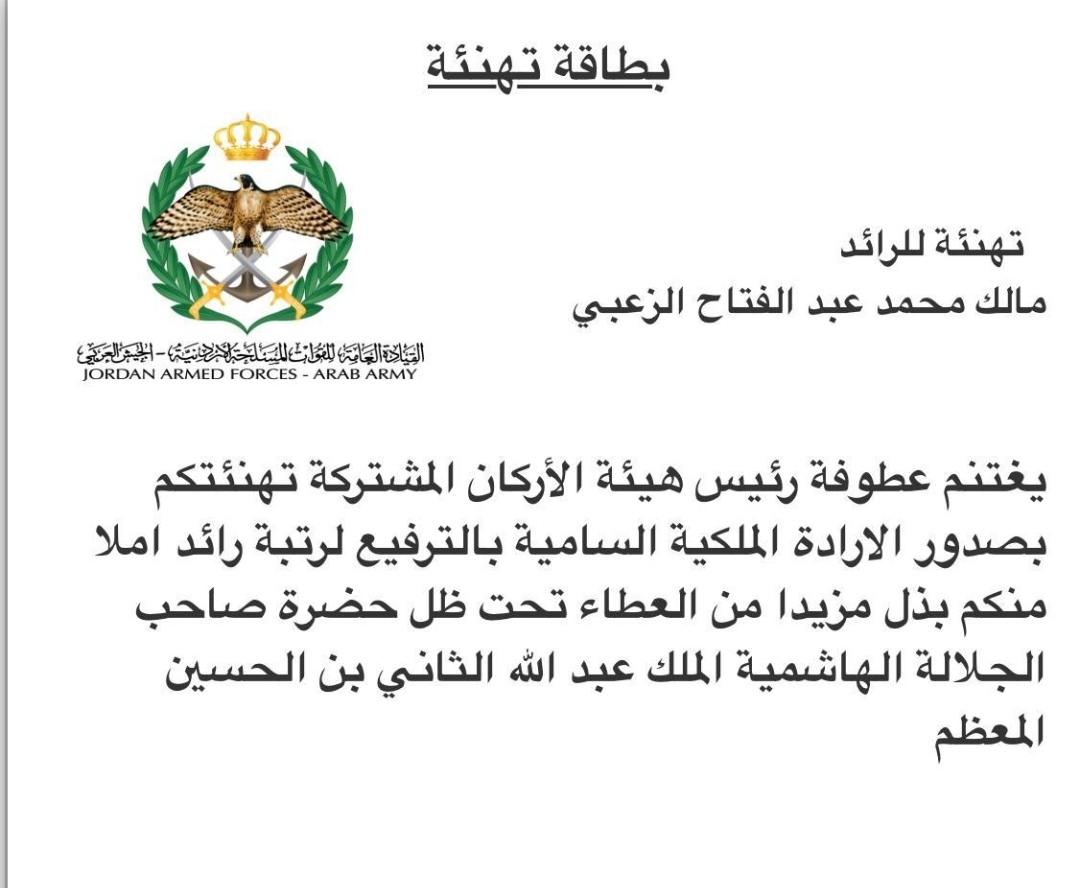 عمون - تتقدم العميد نوف البداوي بالتهنئة والتبريك لنجلها الرائد الطيار مالك محمد عبدالفتاح الزعبي بصدور الإرادة الملكية السامية بترفيعه لرتبة رائد في القوات المسلحة الأردنية سلاح الجو الملكي