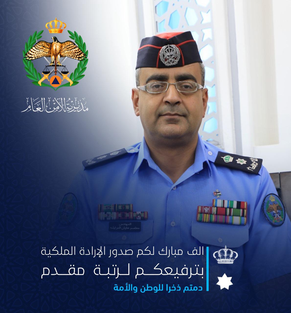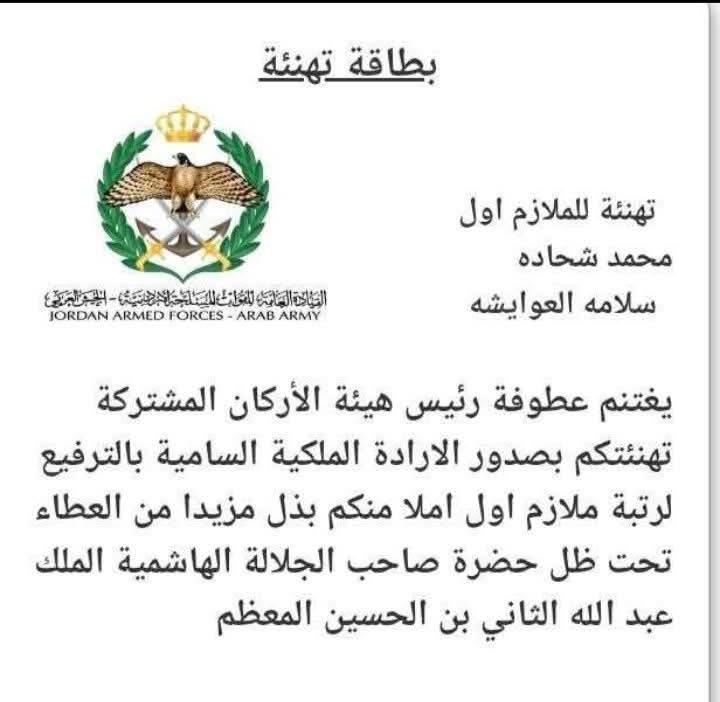 وإننا، ونحن نزفّ إليكم هذه المباركة، نغتنم هذه المناسبة لنعبّر عن اعتزازنا الكبير بكم، ونتمنى لكم المزيد من التقدم والنجاح في حياتكم العملية والميدانية، وأن يبارك الله في خطواتكم، ويزيدكم رفعةً وتميزًا، لتكونوا دومًا في الصفوف الأولى من رجال الوطن الأوفياء، تحت ظلّ راية سيد البلاد، حضرة صاحب الجلالة الهاشمية الملك عبدالله الثاني ابن الحسين المعظم، وولي عهده الأمين الأمير الحسين بن عبدالله الثاني، حفظهما الله ورعاهما.