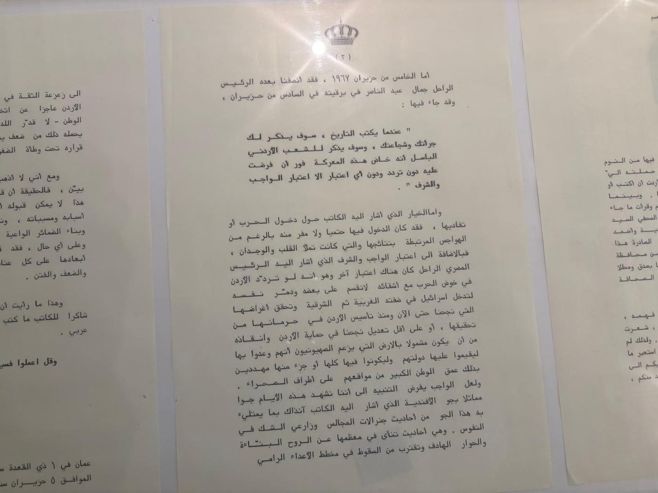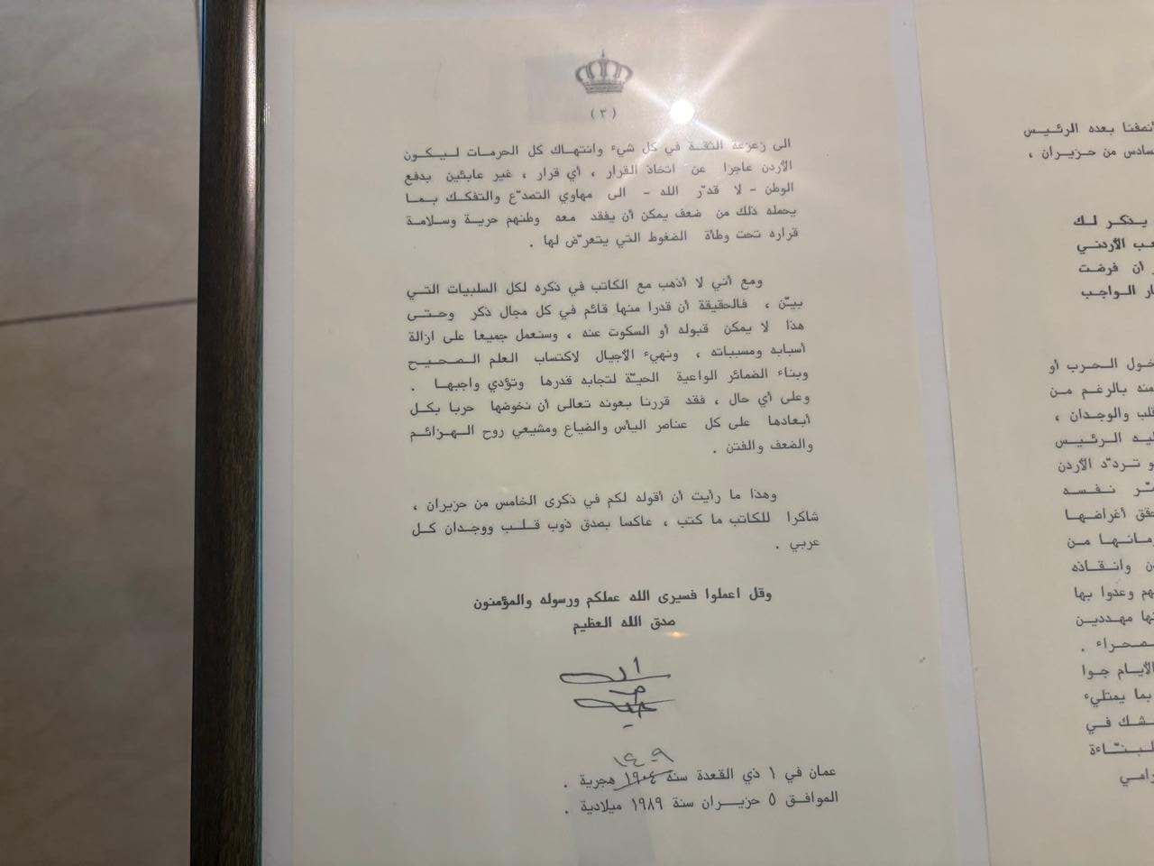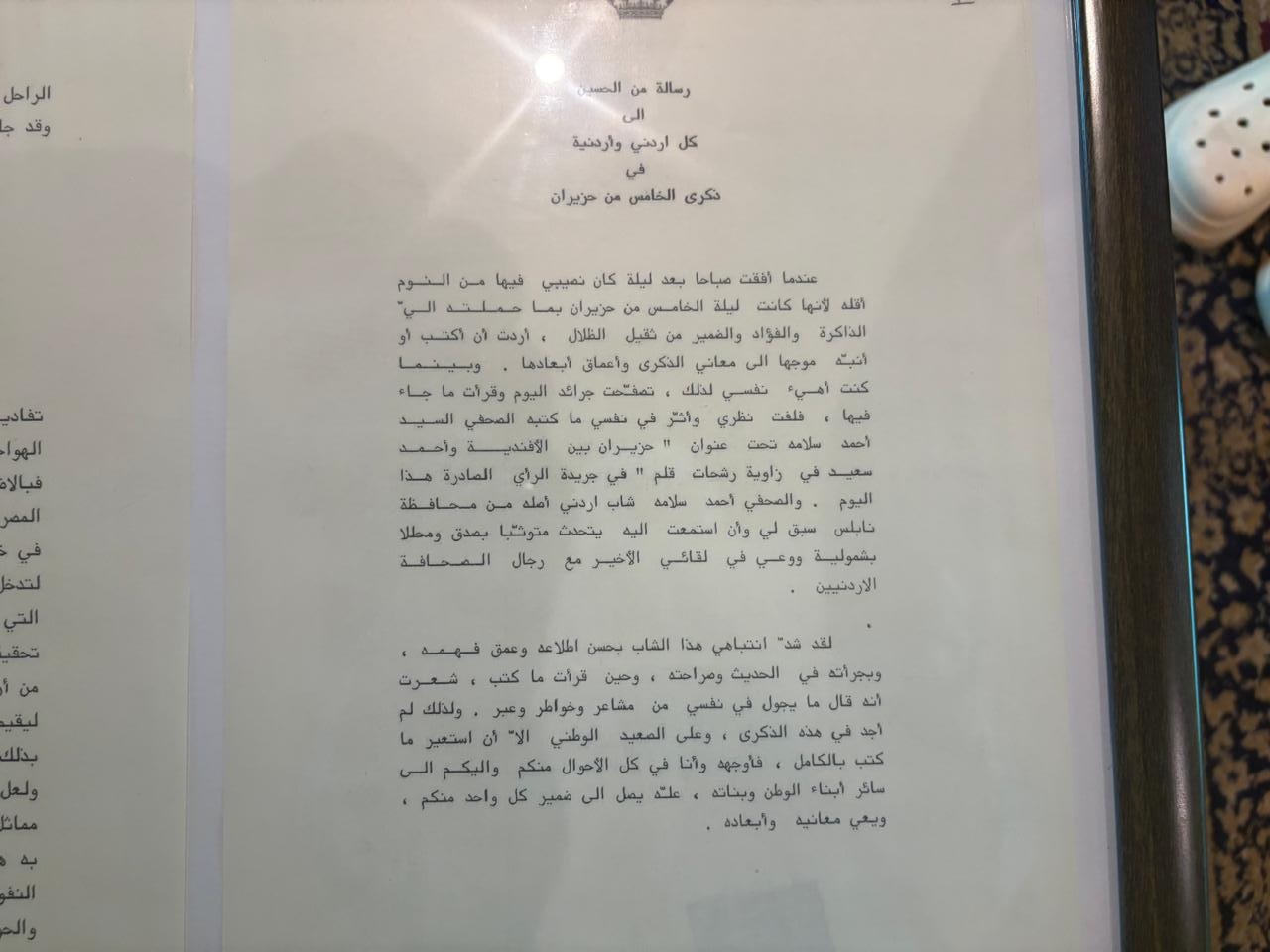 في اليوم التالي.. ارسل جلالة الملك الحسين رسالة لي و للرأي في سابقة في التاريخ بين الحاكم والاعلام بأن إقتبس جلالته مقالتي كرأي له وموقف ارسله الى الامة الاردنية