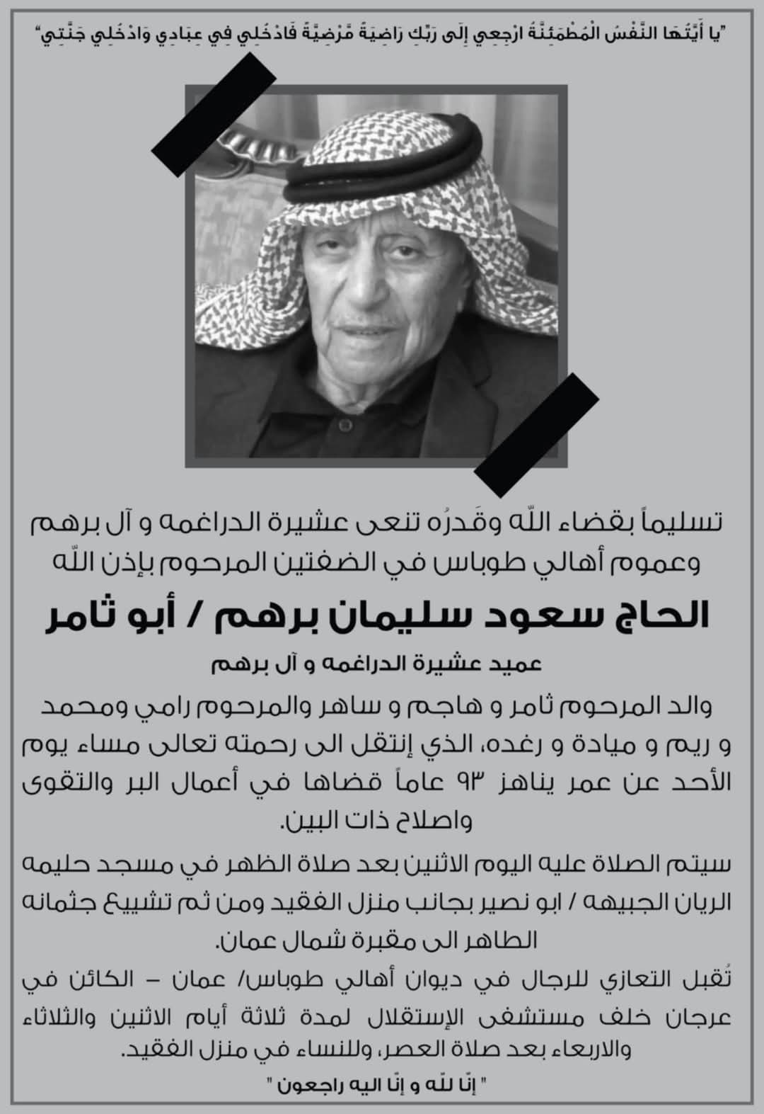 عمون - تسليماً بقضاء الله وقدره تنعى عشيرة الدراغمة وآل برهم وعموم أهالي طوباس في الضفتين المرحوم بإذن الله