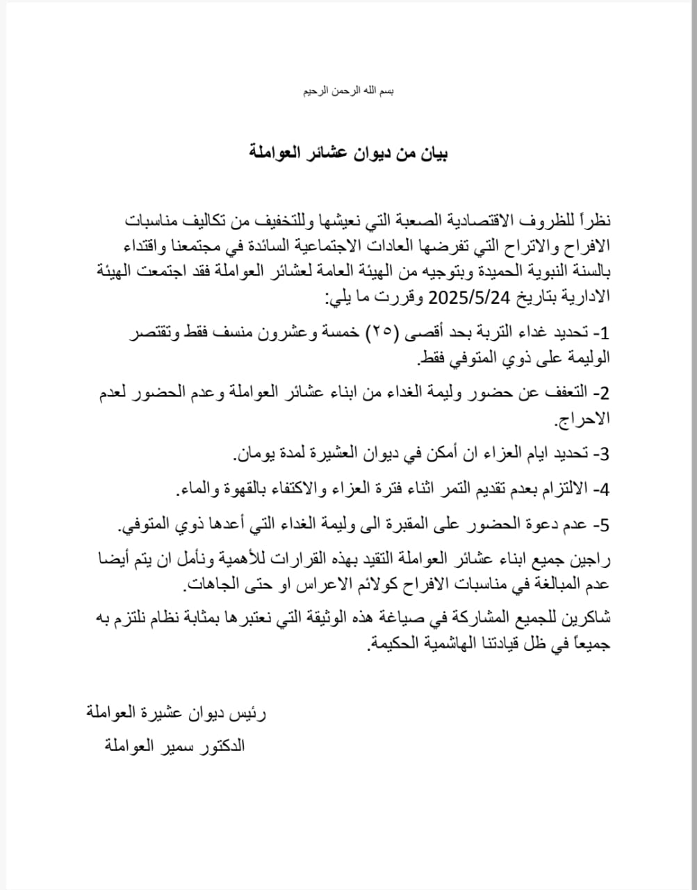 نظراً للظروف الاقتصادية الصعبة التي نعيشها وللتخفيف من تكاليف مناسبات الأفراح والاتراح التي تفرضها العادات الاجتماعية السائدة في مجتمعنا وإقتداء بالسنة النبوية الحميدة وبتوجيه من الهيئة العامة لعشائر العواملة فقد إجتمعت الهيئة الإدارية بتاريخ 24/5/2025 وقررت ما يلي: