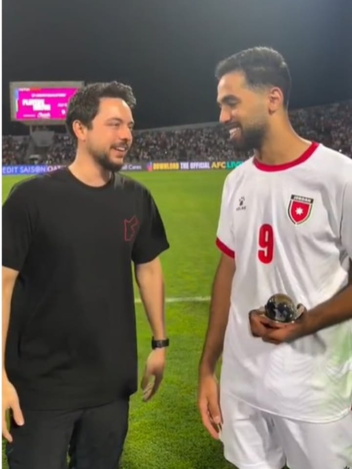 عمون - قدّم سمو الأمير الحسين بن عبد الله الثاني، ولي العهد، وسمو الأمير علي بن الحسين، التهنئة للمهاجم الأردني علي علوان بمناسبة حصوله على جائزة أفضل لاعب في مباراة النشامى أمام العراق، التي أُقيمت على ستاد عمّان الدولي، ضمن الجولة العاشرة والأخيرة من التصفيات الآسيوية المؤهلة إلى نهائيات كأس العالم 2026 في الولايات المتحدة والمكسيك وكندا. |