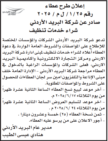 عطاء شراء خدمات التنظيف لشركة البريد الاردني