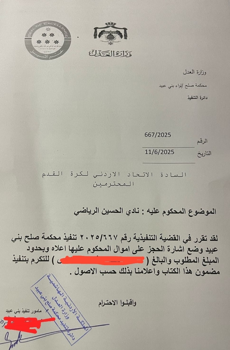قرار قضائي بحجز أموال نادي الحسين إربد11-06-2025 04:44 PM