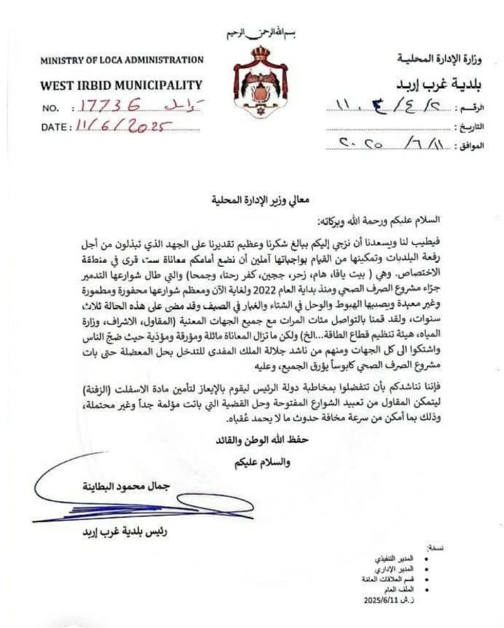 عمون - وجهت بلدية غرب إربد كتابًا رسميًا إلى وزير الإدارة المحلية المهندس وليد المصري، تطالب فيه بتوفير مادة الزفتة اللازمة لإعادة تعبيد الشوارع التي تضررت جراء تنفيذ مشروع الصرف الصحي في المنطقة.