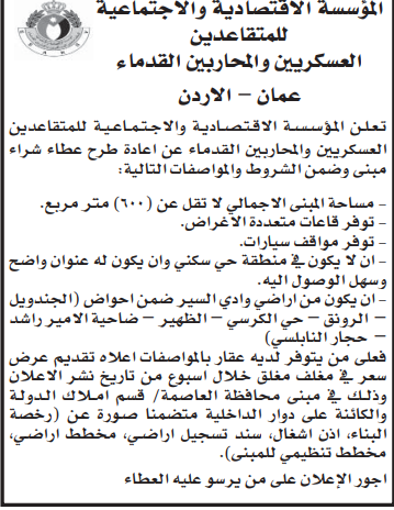 عطاء شراء مبنى للمؤسسة الاقتصادية والاجتماعية للمتقاعدين العسكريين