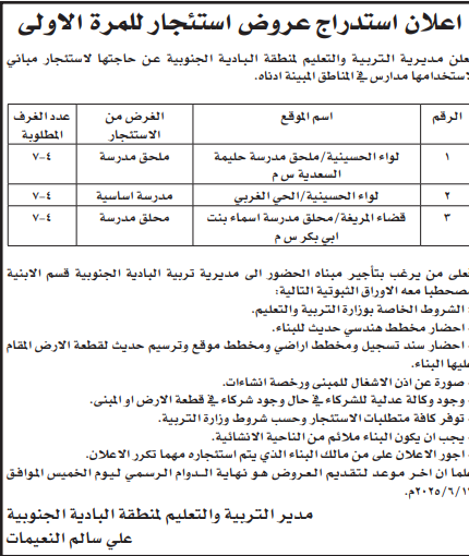 عطاء استئجار ابنية مدرسية لمديرية تربية وتعليم البادية الجنوبية