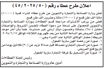 عطاء شراء "120" الف طن قمح