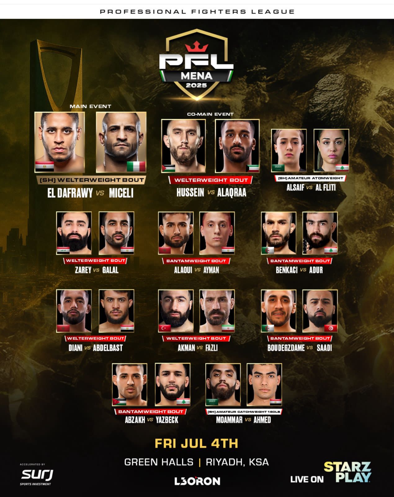 القائمة الكاملة لنزالات 4 يوليو – القاعة الخضراء، الرياض (7 مساءً):