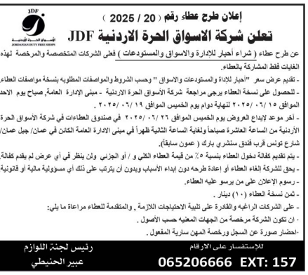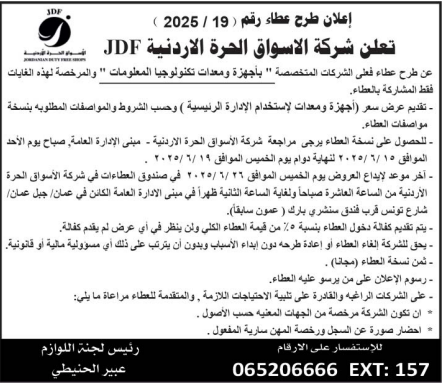عطاءات صادرة عن الاسواق الحرة الاردنية