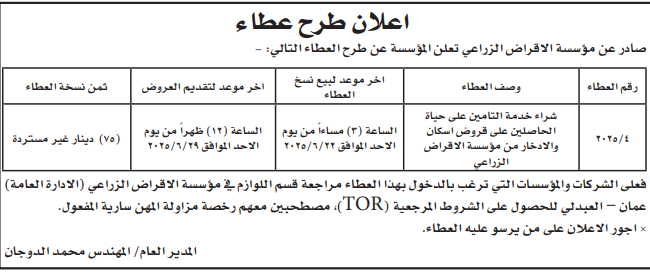 عطاء شراء خدمات التأمين على الحياه للحاصلين على قروض اسكان وادخار من مؤسسة الاقراض الزراعي