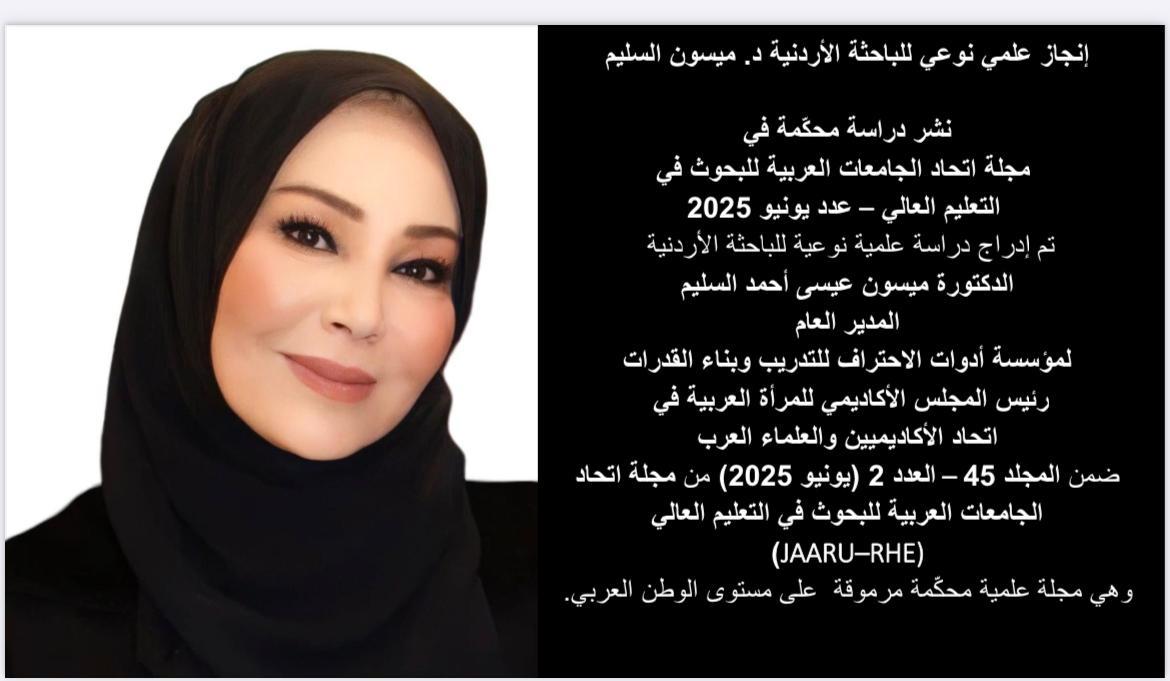 عمون - يتقدم المركز الإعلامي في مؤسسة أدوات الاحتراف للتدريب وبناء القدرات بأحرّ التهاني والتبريكات إلى المدير العام للمؤسسة، الدكتورة ميسون عيسى أحمد السليم، بمناسبة نشر دراستها العلمية المحكّمة في مجلة اتحاد الجامعات العربية للبحوث في التعليم العالي، وذلك ضمن المجلد الخامس والأربعين، العدد الثاني، الصادر في يونيو 2025.