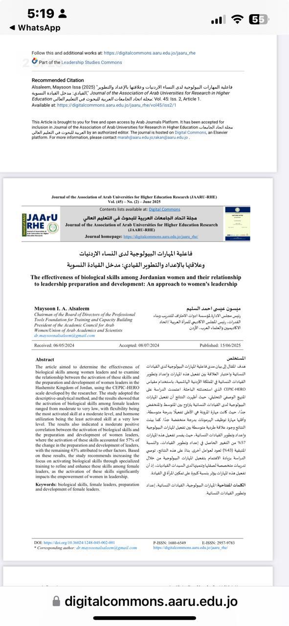 "فاعلية المهارات البيولوجية لدى النساء الأردنيات وعلاقتها بالإعداد والتطوير القيادي: مدخل إلى القيادة النسوية"