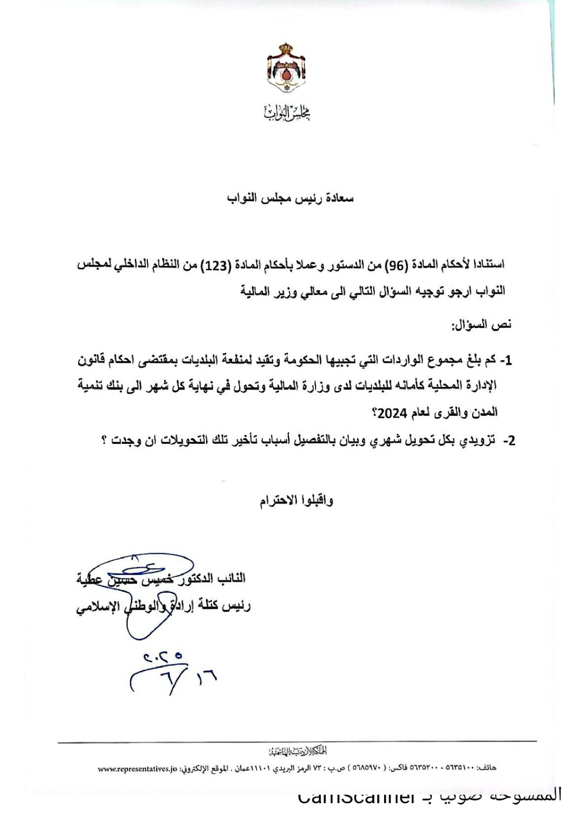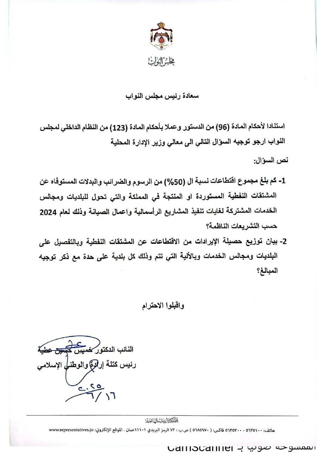 عمون - وجّه النائب خميس عطية، رئيس كتلة "إرادة والوطني الإسلامي"، سؤالًا رقابيًا إلى وزير الإدارة المحلية، استفسر فيه عن مجموع اقتطاعات نسبة الـ50% من الرسوم والضرائب والبدلات المستوفاة عن المشتقات النفطية، سواء المستوردة أو المنتجة محليًا، والتي تُحوَّل إلى البلديات ومجالس الخدمات المشتركة لتنفيذ المشاريع الرأسمالية وأعمال الصيانة.