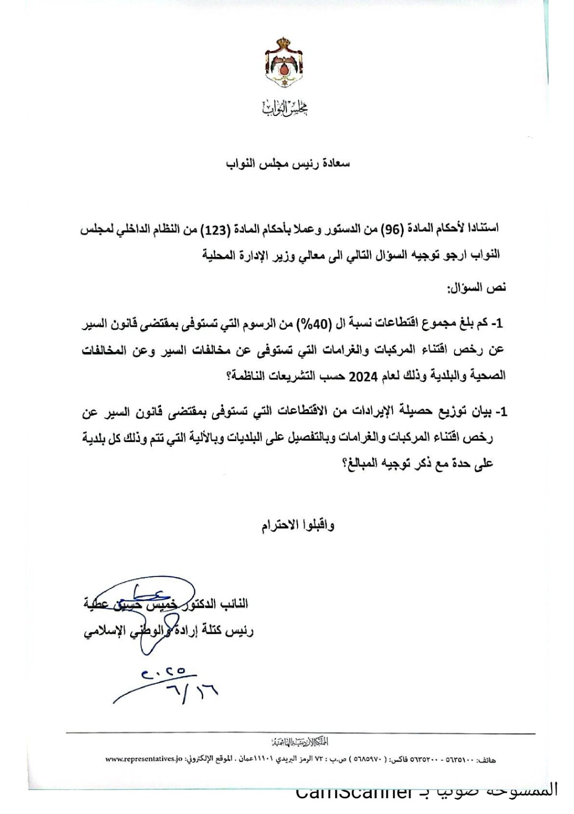 - مجموع اقتطاعات نسبة الـ40% من الرسوم والغرامات المستوفاة بموجب قانون السير والمخالفات الصحية والبلدية لعام 2024.