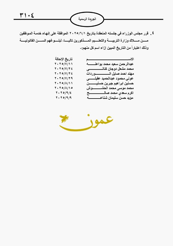 عمون - صدر في الجريدة الرسمية العدد "3102" الاثنين، قرار مجلس الوزراء بالموافقة على احالة كل من الموظفين المذكورين تاليا إلى التقاعد اعتبارا من التاريخ المبين إزاء اسمه لبلوغه السن القانونية، وكذلك ترفيعات لعدد من الموظفين.