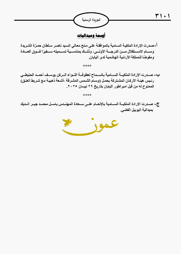 إرادات ملكية بالسماح لشخصيات أردنية بحمل أوسمة (أسماء)16-06-2025 07:40 PM