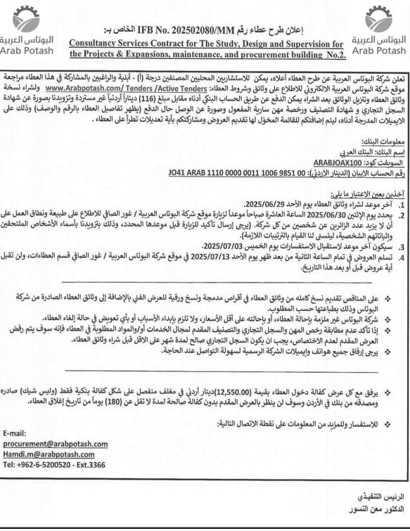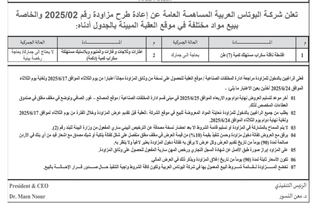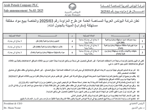 عطاءات صادرة عن شركة البوتاس العربية