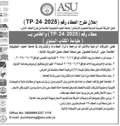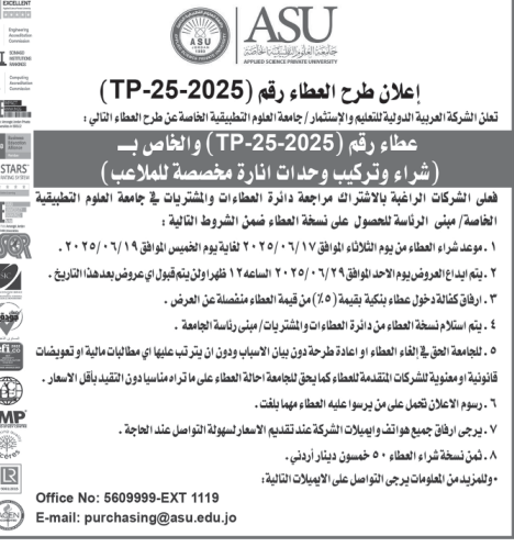 عطاءات صادرة عن جامعة العلوم التطبيقية الخاصة