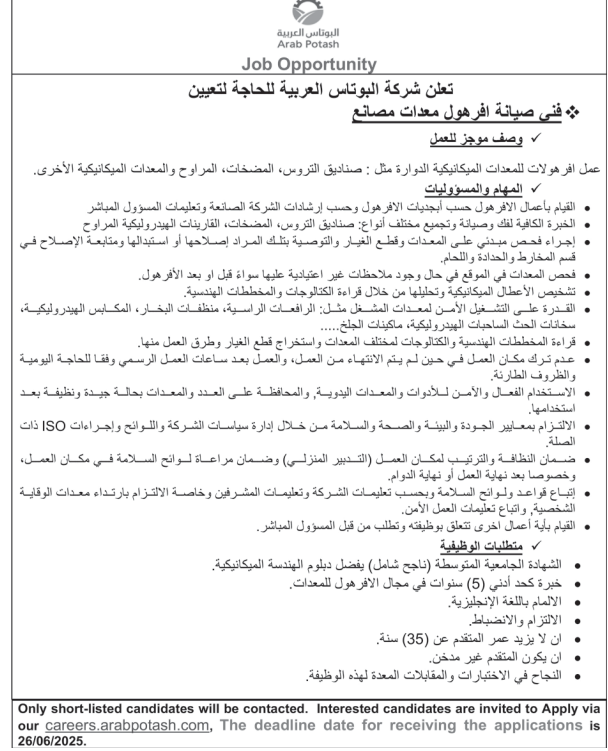وظيفة شاغرة لدى شركة البوتاس العربية