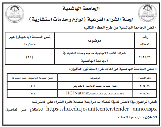 عطاءات صادرة عن الجامعة الهاشمية