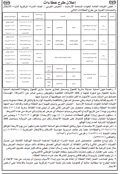 عطاءات صادرة عن القيادة العامة للقوات المسلحة الاردنية