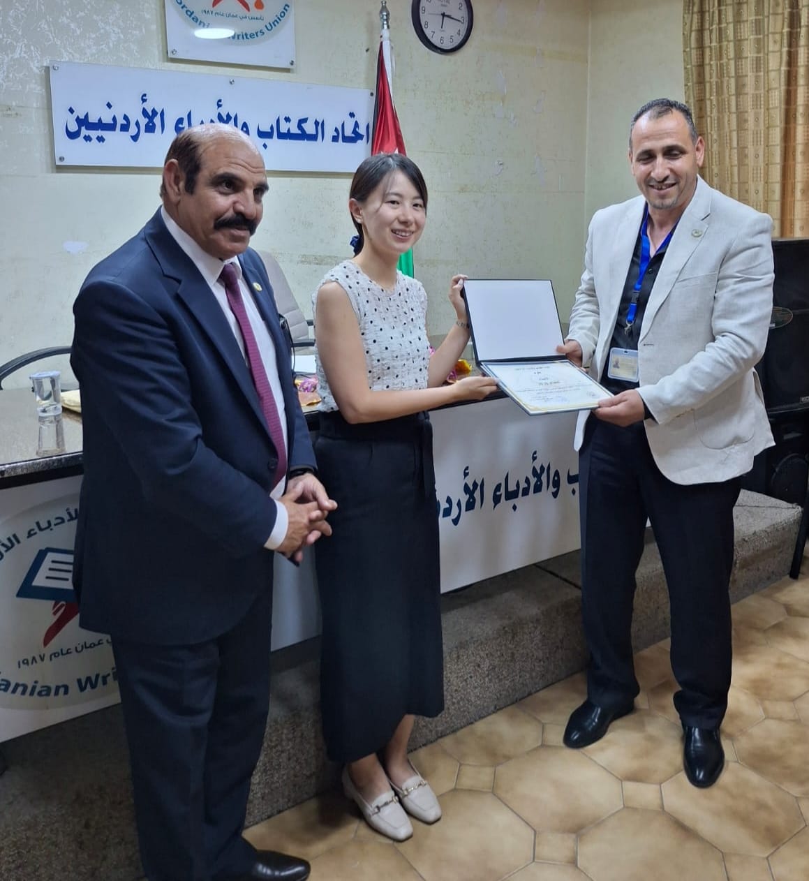 وفي نهاية الفعالية قدّم سعادة رئيس اتحاد الكُتّاب والأدباء الأردنيين/ الشاعر عليان العدوان الشهادات التكريمية للمشاركين، بمعية السيدة/ ميكا يامادا/ الملحق الثقافي في السفارة اليابانية.