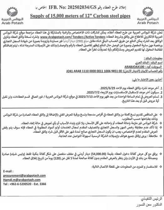 عطاء صادر عن شركة البوتاس العربية