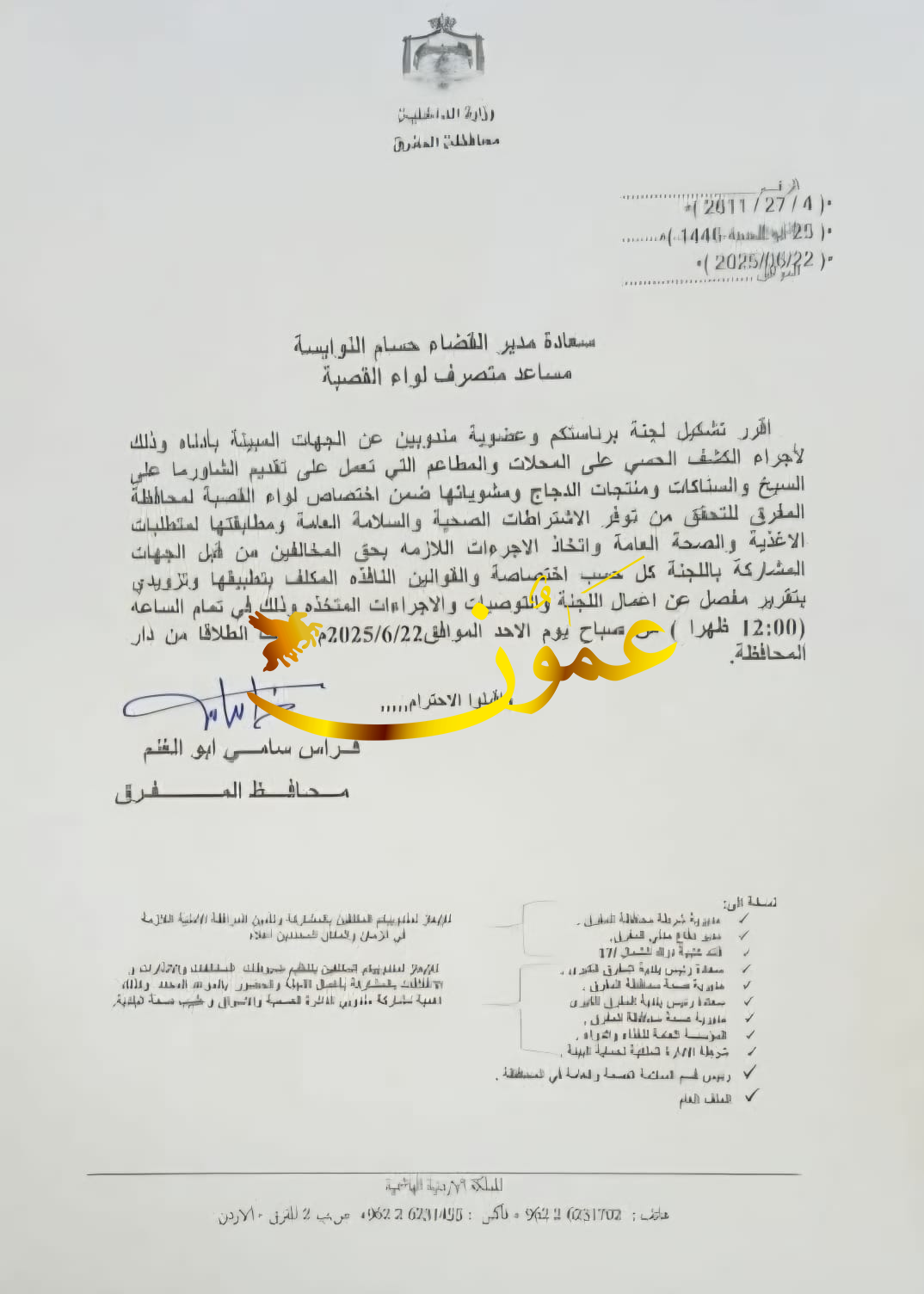 عمون - ينال المعاني - قرر محافظ المفرق سامي ابو الغنم تشكيل لجنة من مدير القضاء حسام النوايسة وعضوية مندوبين عن الجهات المعنية لإجراء الكشف الحسي على المحلات والمطاعم التي تعمل على تقديم الشاورما على السيخ والسناكات ومنتجات الدجاج ومشوياتها ضمن اختصاص لواء قصبة محافظة المفرق للتحقق من توفر الاشتراطات الصحية والسلامة العامة ومطابقتها لمتطلبات الاغذية والصحة العامة والصحة العامة. |