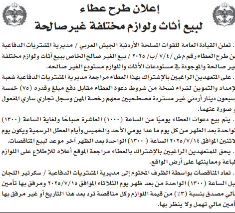 عطاء صادر عن القيادة العامة للقوات المسلحة الاردنية