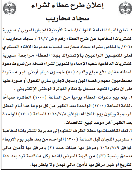 عطاء شراء سجار محاريب للقيادة العامة للقوات المسلحة الاردنية