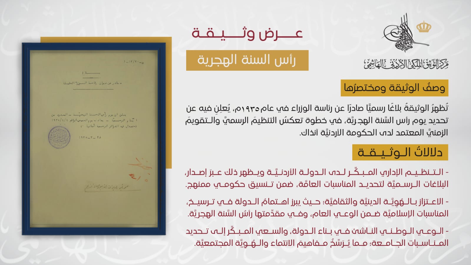 عمون - عرض مركز التوثيق الملكي الأردني الهاشمي، وثيقة تعد من أقدم البلاغات الرسمية الصادرة عن رئاسة الوزراء في الدولة الأردنية، تحدد عبرها يوم رأس السنة الهجرية، والذي صادف 4 نيسان 1935، وتعده إجازة رسمية للدوائر الحكومية. |