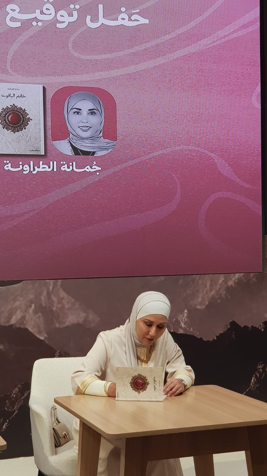 عمون - وقّعت الشاعرة الأردنية جمانة الطراونة ديوانها الخامس"خاتم الياقوت" في حفل أقامته دارة الشعر العربي بالفجيرة يوم الجمعة الماضي يونيو الجاري في مقرّ الدارة الكائن ببيت الفلسفة بالفجيرة.