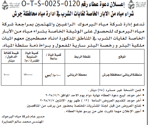 عطاء صادر عن شركة مياه اليرموك