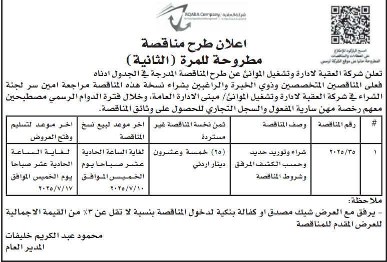 عطاء صادر عن شركة العقبة لادارة وتشغيل الموانئ
