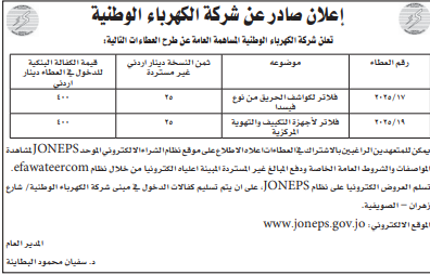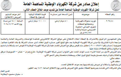 عطاءات صادرة عن شركة الكهرباء الوطنية