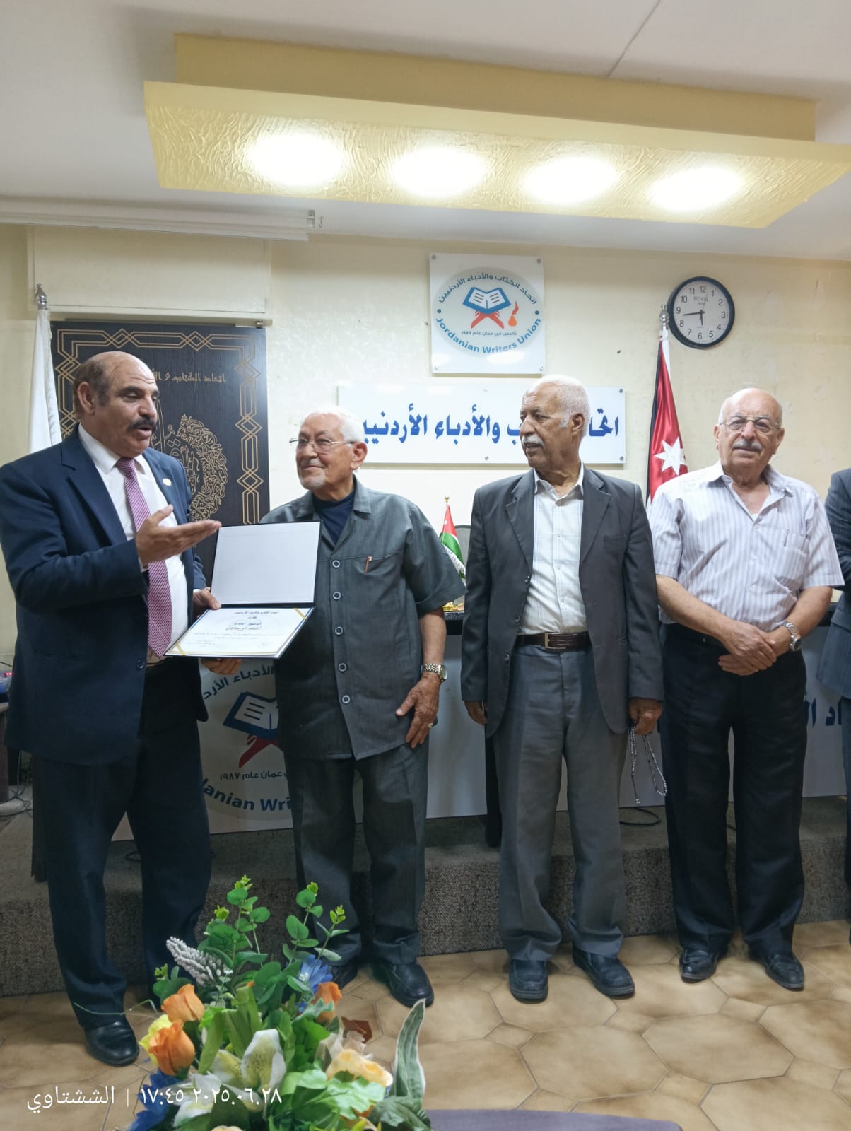 وفي نهاية الأمسية قدم رئيس اتحاد الكتاب والادباء الاردنيين السيد عليان العدوان شهادات التقدير تكريما للمشاركين في الأمسية. وتم التقاط الصور التذكارية بهذه المناسبة