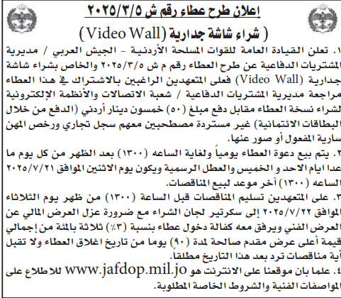 عطاء صادر عن القيادة العامة للقوات المسلحة الاردنية