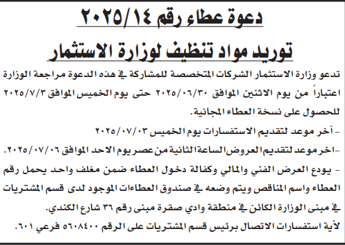 عطاء شراء مواد تنظيف لوزارة الاستثمار