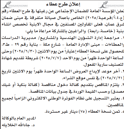 عطاء صادر عن المؤسسة العامة للضمان الاجتماعي