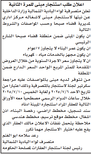 عطاء استئجار مبنى لمتصرفية لواء البادية الشمالية