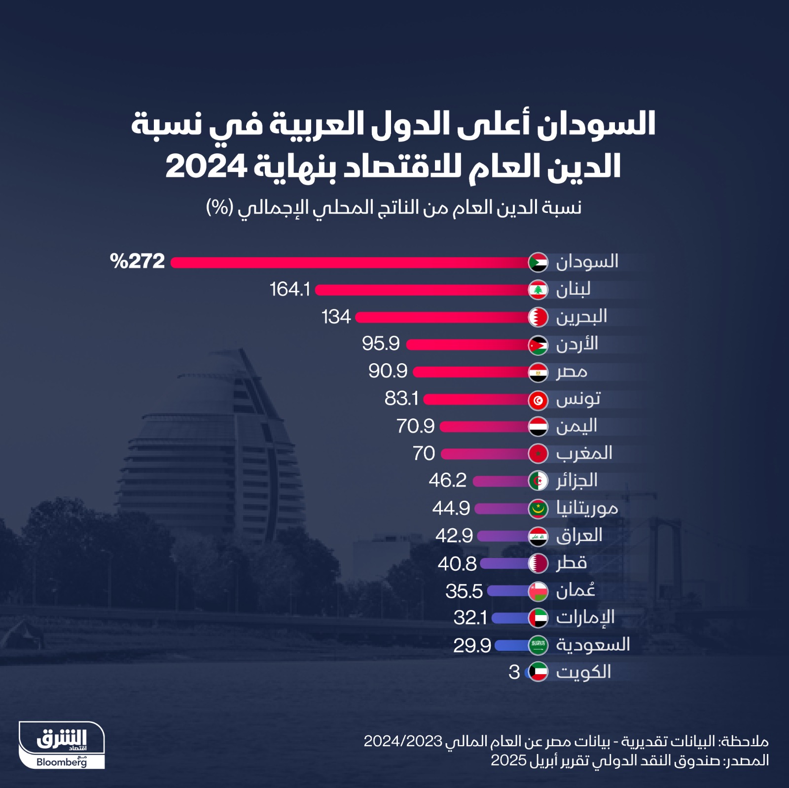 بحسب تقرير صندوق النقد، السودان هو الأعلى ديوناً بين الدول العربية، إذ بلغت نسبة الدين العام إلى الناتج المحلي 271.979% في عام 2024، ويُتوقع تراجعها إلى 251.98% هذا العام.