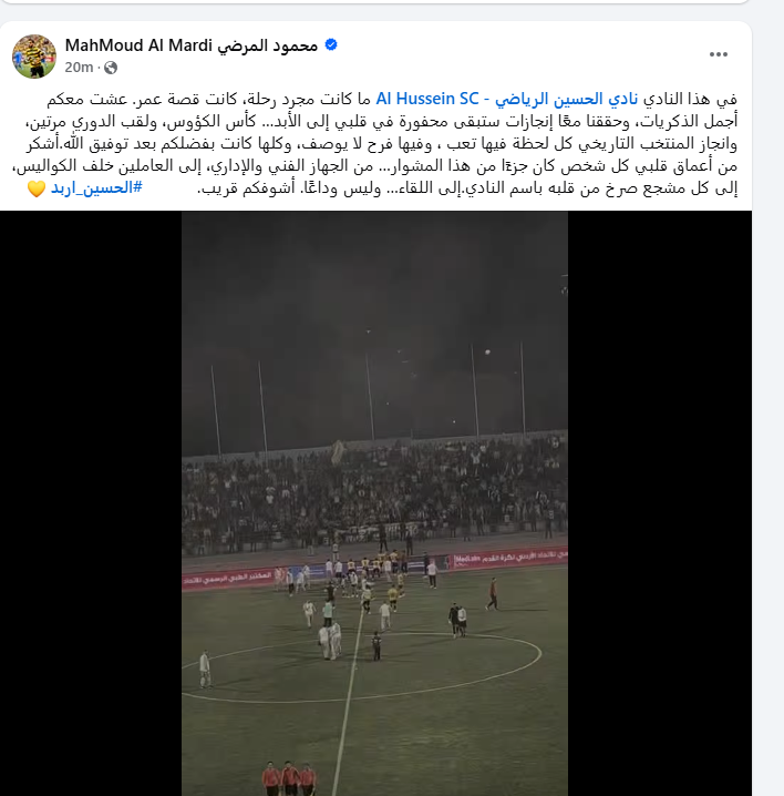 عمون - خاطب نجم المنتخب الوطني محمود المرضي جماهير ناديه الحسين، مودعًا إياهم بعد انتهاء مسيرته مع بطل دوري المحترفين.