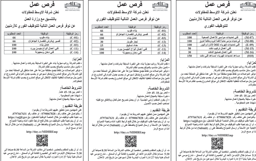 وظائف شاغرة لدى شركة الاوسط للمقاولات