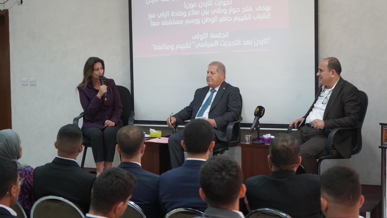وفي افتتاح الجلسة الحوارية التي عقدت في قاعة هيئة شباب كلنا الأردن في خلدا، قالت المديرة التنفيذية لجمعية عون الأردن، نور الدويري إن هذه الجلسة تأتي ضمن المساعي المستمرة لفتح مساحة آمنة ومفتوحة للنقاش حول القضايا الوطنية الملحة، وتمكين الشباب من المساهمة الفاعلة في رسم خارطة طريق لمستقبل الأردن وأنهم يؤمنون بأن الحوار هو السبيل الأمثل لتقريب وجهات النظر وتفعيل دور الشباب في الحياة العامة. وهي ضمن تنفيذ لتوجيهات الملكية إشراك الشباب مع صناع القرار .
