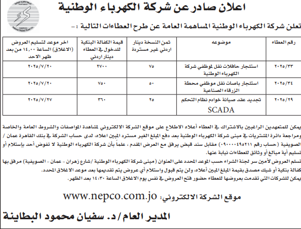 عطاءات صادرة عن شركة الكهرباء الوطنية