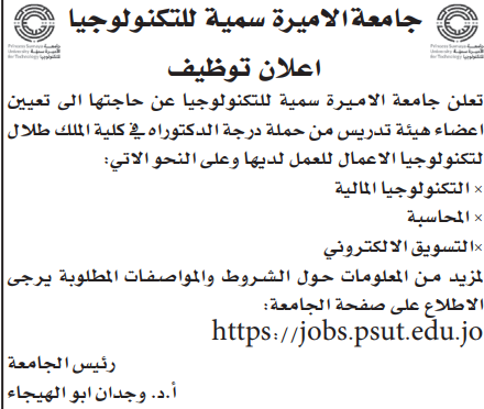 جامعة الاميرة سمية للتكنولوجيا بحاجة لتعيين أعضاء هيئة تدريسية